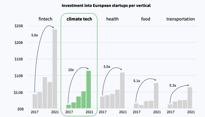 Das europäische ClimateTech Start-up Ökosystem ist derzeit (Stand April 2022) über 100 Milliarden schwer und hat seinen Wert damit innerhalb von zwei Jahren verdoppelt. Seit 2017 ist der ClimateTech Sektor in Europa damit schneller gewachsen als jeder andere, mit zweieinhalbmal so vielen Frühphasen-Investitionen.